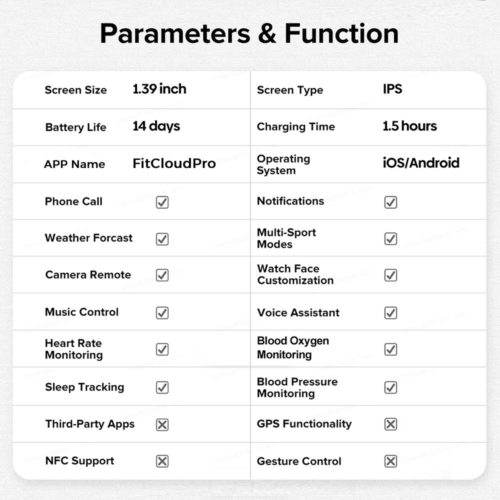 Functions: step counting, heart rate monitoring, Bluetooth calling, smart reminder, sleep monitoring, blood oxygen detection